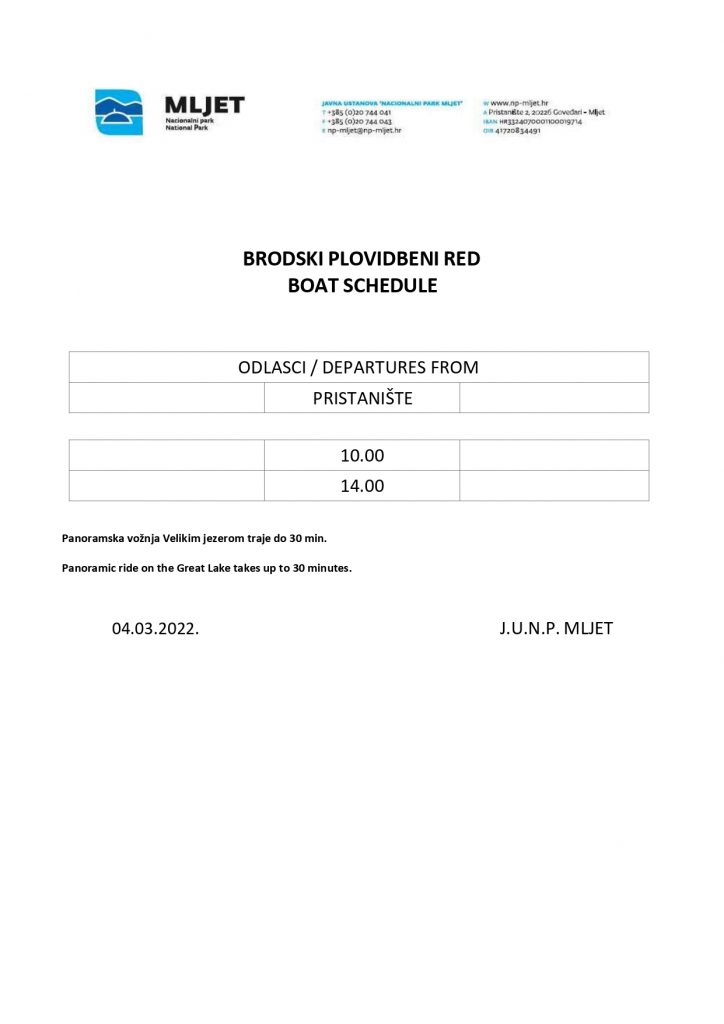 tijekom ožujka NP Mljet možete posjetiti od petka do nedjelje od 8 do 15h. U sklopu ulaznice je uključena i panoramska vožnja brodom po Velikom jezeru.