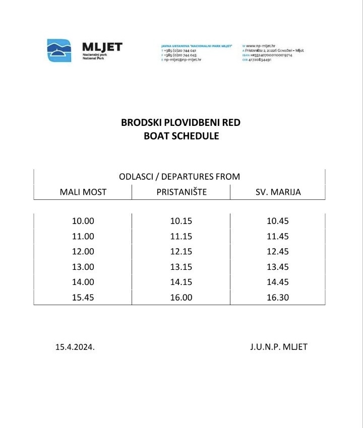 Autor objave:Lucija Radulj Objava objavljena:15.04.2024 Kategorija objave:Novosti Dragi posjetitelji, od ponedjeljka 15.4.2024. vrijedi novi brodski raspored a posjet otoku Sv. Marija. Podijeli objavu Share this content Opens in a new window Opens in a new window Opens in a new window Opens in a new window Opens in a new window Opens in a new window Možda nešto kao Poziv za javnu prodaju – licitaciju električnog automobila MITSUBISHI MIEV 04.02.2025 Oglas za prijam u radni odnos radnika (m/ž) 05.09.2024 Predavanje “Kartiranje flore te istraživanje vegetacije i staništa Nacionalnog parka Mljet” 12.2. u Galeriji “Stara skula” 01.02.2019