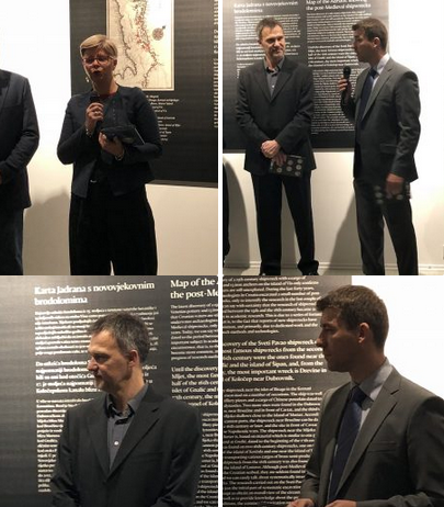 U pozdravnom govoru, posjetiteljima su se obratili autor izložbe dr. sc. Igor Miholjek, voditelj Odjela za podvodnu arheologiju Hrvatskog restauratorskog zavoda, dr. sc. Ana Azinović Bebek, pomoćnica ravnateljice Hrvatskoga restauratorskog zavoda, mr. sc. Sanjin Mihelić, ravnatelj Arheološkog muzeja u Zagrebu te dipl. ing. Ivan Sršen, ravnatelj Nacionalnog parka Mljet.